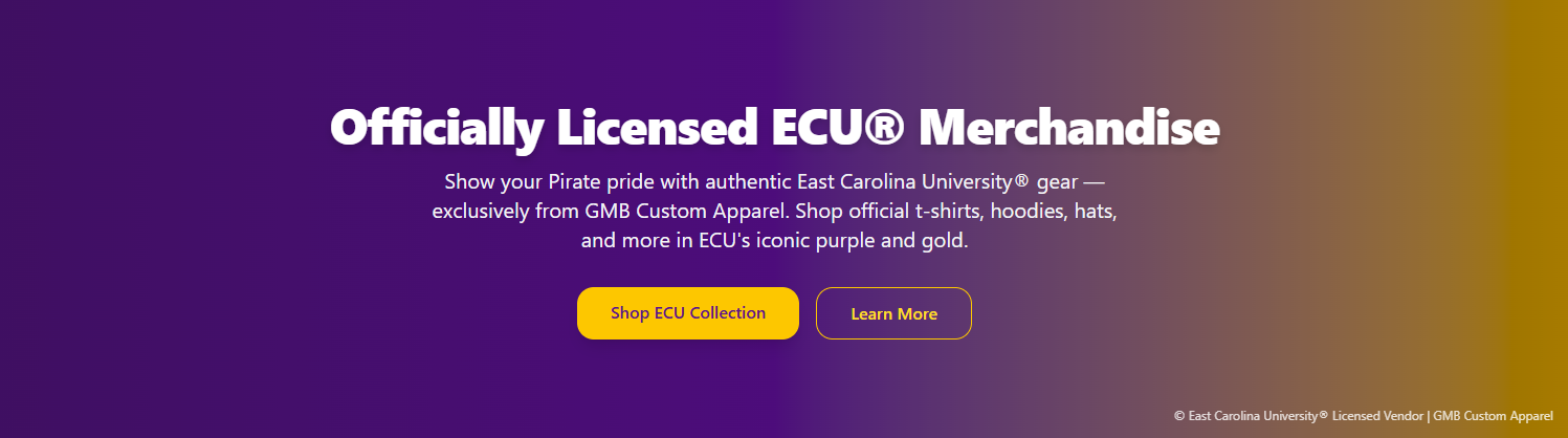 From high-quality screen-printed tees to embroidered polos, picture engravings, and officially licensed ECU merchandise, everything is discounted with no minimums.