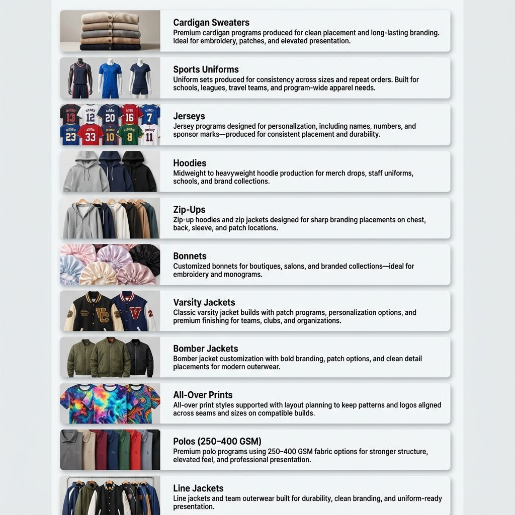 This manufacturing service supports premium, highly customized apparel such as cardigan sweaters, sports uniforms, jerseys, hoodies, zip-ups, bonnets, varsity jackets, bomber jackets, all-over prints, premium polos (250–400 GSM), and line jackets.
