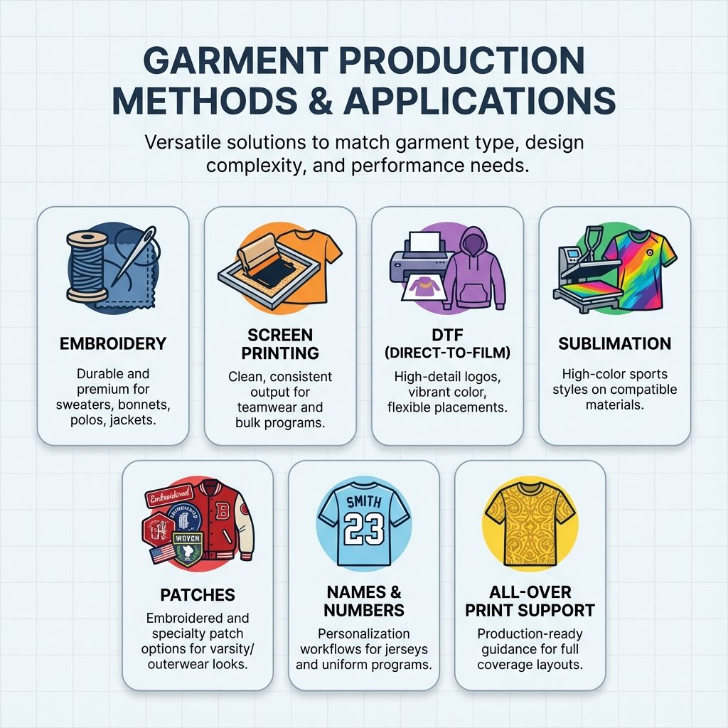 Multiple production methods are available to match garment type, design complexity, and performance needs: