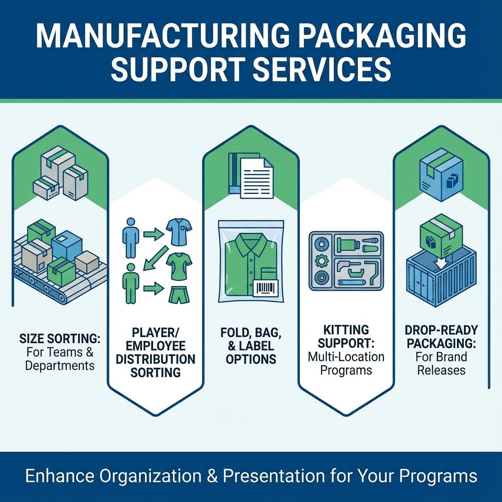Uniform and jersey programs require accuracy—consistent decoration, repeatable placement, and organized personalization. Programs can be supported with sorting and packaging options to simplify distribution.